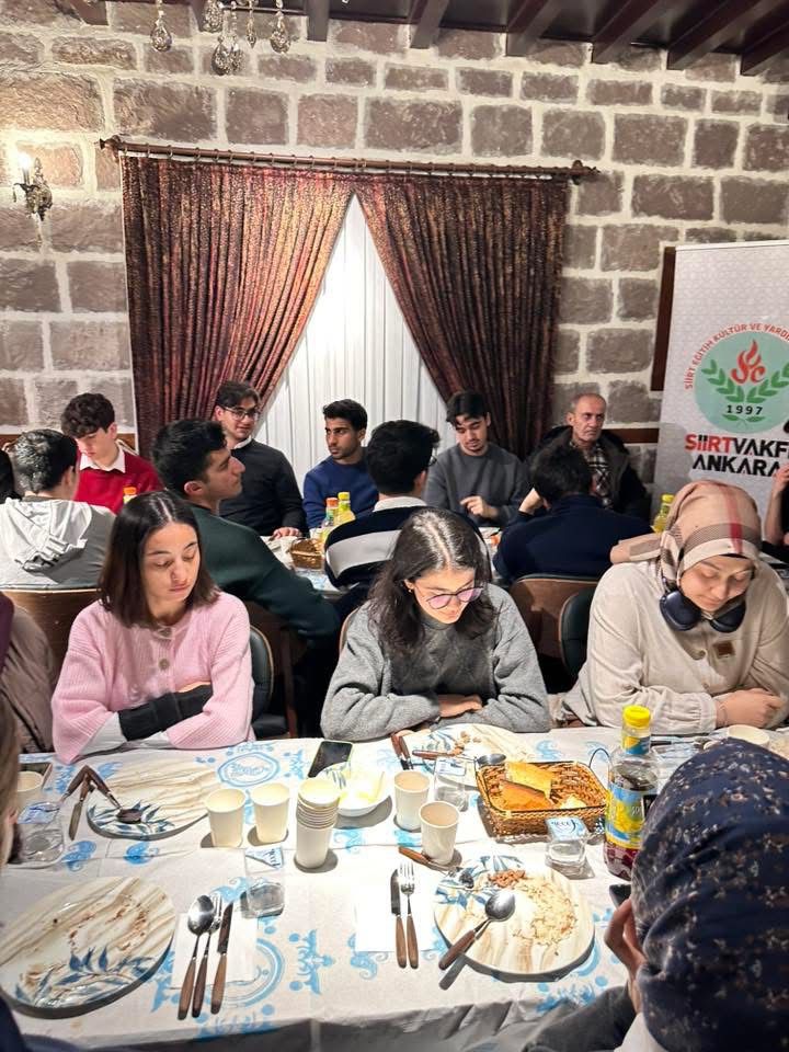 Ankara’da çeşitli üniversitelerde öğrenim gören Siirtli öğrenciler, Ramazan ayı dolayısıyla düzenlenen akşam yemeğinde bir araya geldi. Öğrenciler, Siirt Eğitim Kültür ve Yardımlaşma Vakfı Ankara Şubesi yönetim kurulu üyeleri tarafından vakfın hizmet binasında ağırlandı.