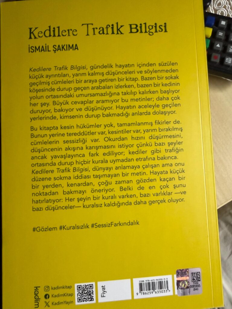 Kedilere Trafik Bilgisi adıyla yayınlanan eserinde Şakıma, gündelik hayatın içinden süzülen küçük ayrıntıları yarım kalmış düşünceleri ve söylenmeden geçilmiş cümleleri bir araya getirmiş.