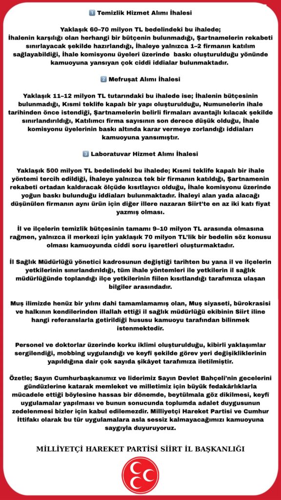 Milliyetçi Hareket Partisi (MHP) Siirt İl Başkanı Cengizhan Tükenmez, sosyal medya hesabından yaptığı açıklamada, geçtiğimiz günlerde bir kamu kurumunda tespit ettiklerini belirttiği bazı iddialarla ilgili değerlendirmelerde bulundu.