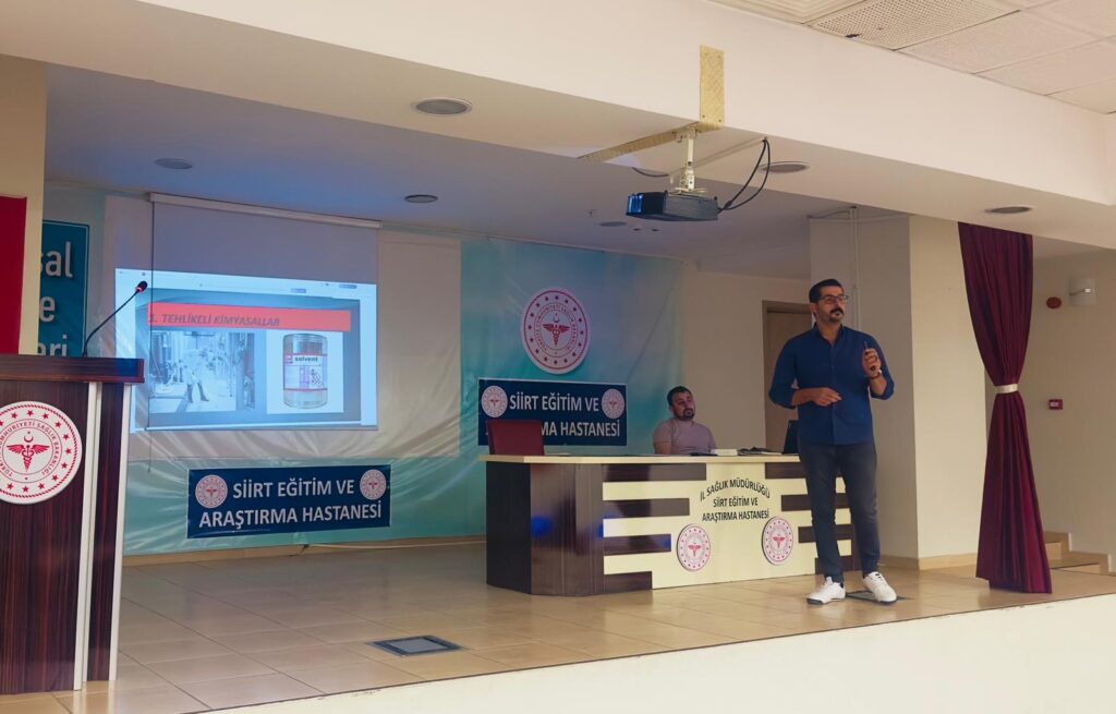 Siirt Eğitim ve Araştırma Hastanesi Konferans Salonu’nda, sağlık personeline yönelik “Tehlikeli Maddeler Farkındalık Eğitimi” düzenlendi. Eğitimi, alanında uzman Eğitimci Amed Özbey tarafından verildi.