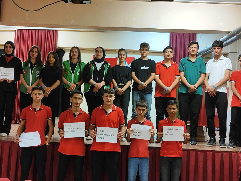 Okul öğrencilerinden Arzu Demir: Masum Filistin halkının yok edilmesini kınıyoruz. İsrail’in yaptığı vahşi saldırılar sonucunda çok kişi şehit oldu ve yaralandı. Bu durumu anlatmak için böyle güzel bir etkinlikte buluştuk dedi.