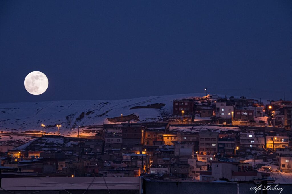Türksoy’un objektifine yansıyan karelerde, gün batımı sonrası oluşan “Mavi Saat”in (Blue Hour) lacivert tonları ile Siirt evlerinden yayılan sıcak sarı ışıklar eşsiz bir kontrast oluşturdu. Karlı dağların silüeti üzerinden yükselen Dolunay, şehrin basamaklı yerleşim dokusuyla aynı karede buluşarak izleyenleri büyüledi.