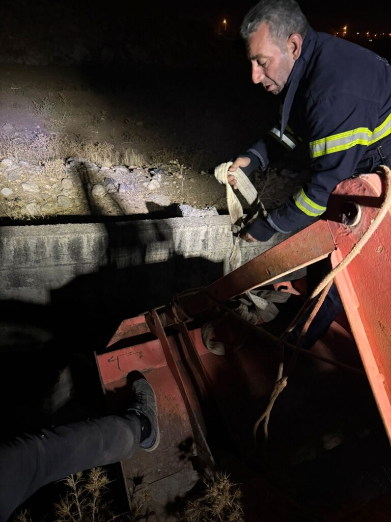Yaklaşık 2 metre derinliğindeki kanala düşerek mahsur kalan ineğin çıkarılması için çevredekilerin ihbarı üzerine Siirt Belediyesi İtfaiye Müdürlüğü ekipleri hızla bölgeye sevk edildi. Ekipler, kepçe yardımıyla kanala yaklaşarak halatla ineği sabitleyip kontrollü şekilde yukarı çekti.