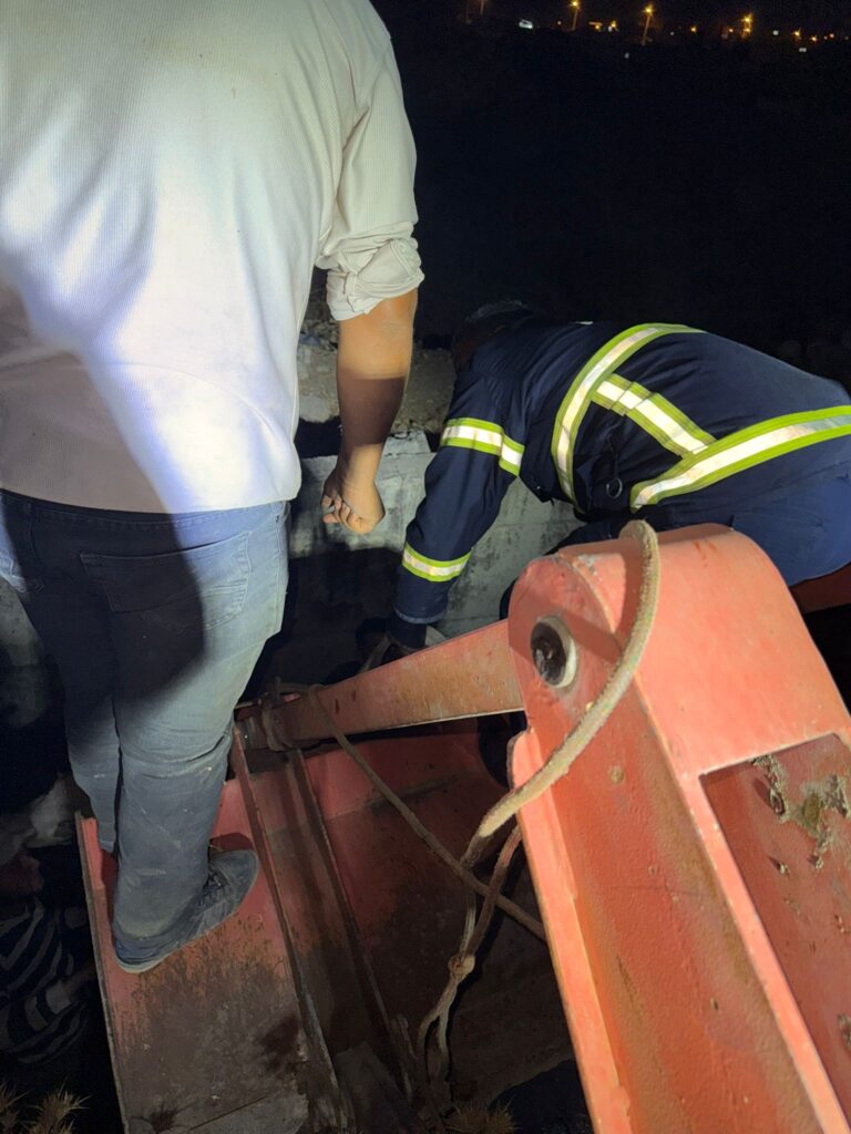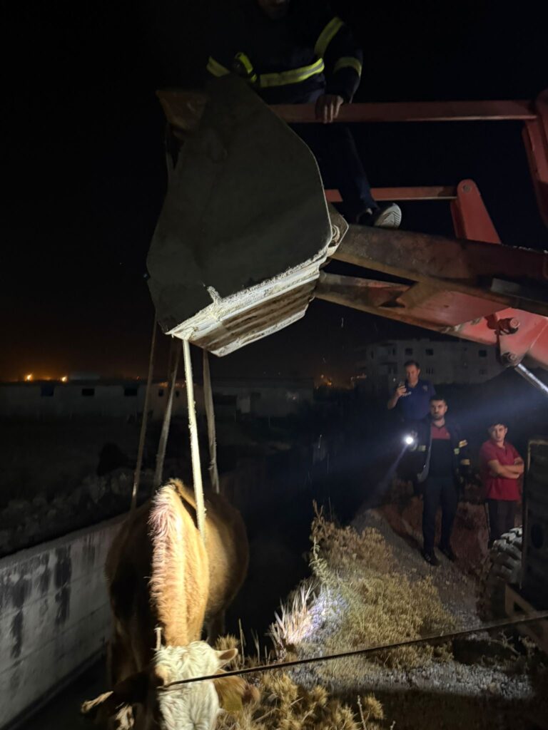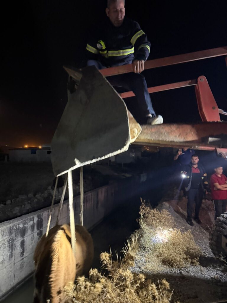 Siirt’in Şavuran Mahallesi’nde pis su arıtma kanala düşen inek, itfaiye ekiplerinin halatlı müdahalesi ve kepçe desteğiyle kurtarıldı.