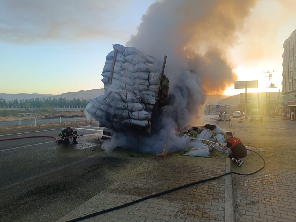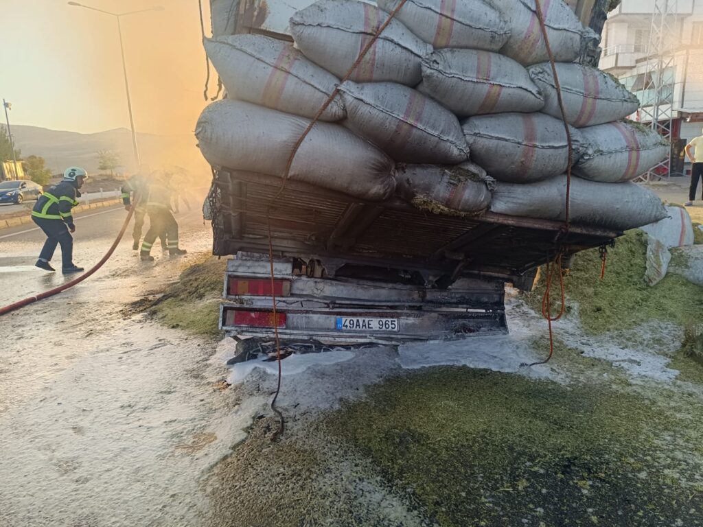 Ayhan Ayna yönetimindeki 49 AAE 965 plakalı kamyonun lastik bölümünde, henüz belirlenemeyen bir nedenle başlayan yangın kısa sürede yük kısmına sıçradı. Kamyondaki yaklaşık 14 ton saman alevler içinde kaldı.