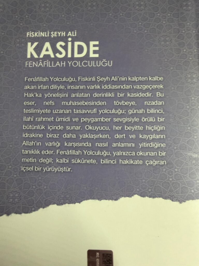 “Şeyh Ali Fiski’ne Kaside: Fenafillah Yolculuğu” adıyla yayımlanan eserde, kalpten kalbe akan irfan diliyle insanın varlık iddiasından vazgeçerek Hakk’a yönelişi derinlikli bir şekilde anlatan kaside yer alıyor. Büyük boy ve 275 sayfadan oluşan kitap, Nizamiye Akademi Yayınları tarafından yayımlandı.